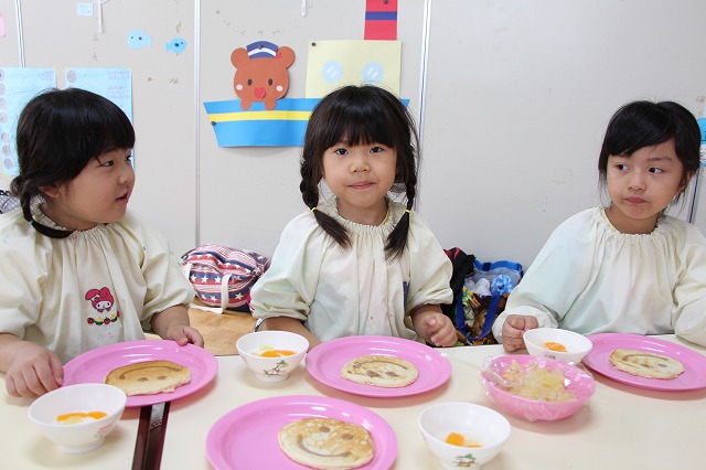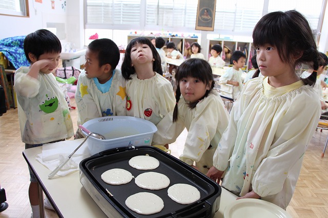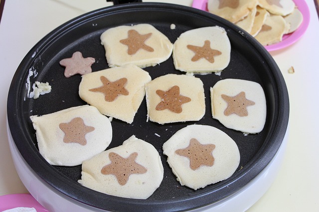 ホットプレートでニコちゃんパンケーキを作ります。